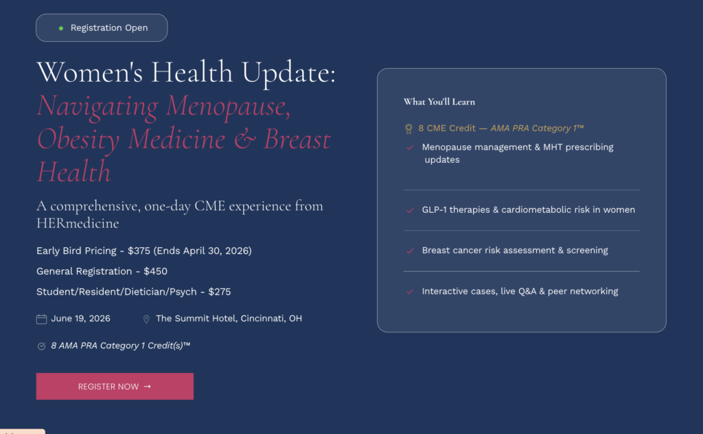 Join HERmedicine for a one-day CME experience on June 19, 2026 in Cincinnati, Ohio, discussing menopause & MHT prescribing, obesity medicine and GLP-1 therapies, and breast cancer risk and screening. The International Atherosclerosis Society is sponsoring a lunch session discussing cardiometabolic risk in women.